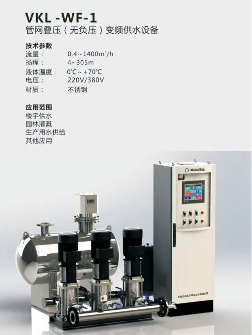 菜单产品中心Product center 热门产品 →CDL,CDLF系列轻型立式多级离心泵 →NiSO,NiS,NiSF系列端吸离心泵 →TD系列管道循环泵 →VKL-HY恒压变频供水设备 您的位置:首页 →产品展示 < > VKL-WF-1管网叠压(无负压)变频供水设备关键词: 简介: 在线咨询 返回列表 产品说明 相关产品 CDL,CDLF系列轻型立式多级离心泵 NiSO,NiS,NiSF系列端吸离心泵 TD系列管道循环泵 VKL-HY恒压变频供水设备 VKL-WF-1管网叠压(无负压)变频供水设备 VKL--WF-2管网叠压(无负压)变频供水设备